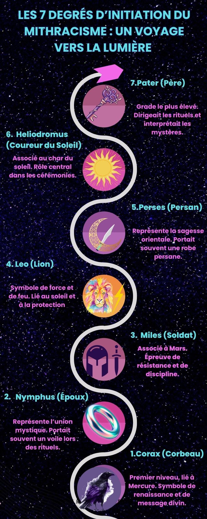 Contrairement aux religions publiques de Rome, le mithracisme était un culte à mystère : ses rituels et ses enseignements étaient strictement réservés aux membres. Les adeptes, principalement des hommes, devaient passer par sept degrés d’initiation, chacun associé à un symbole et à des épreuves.